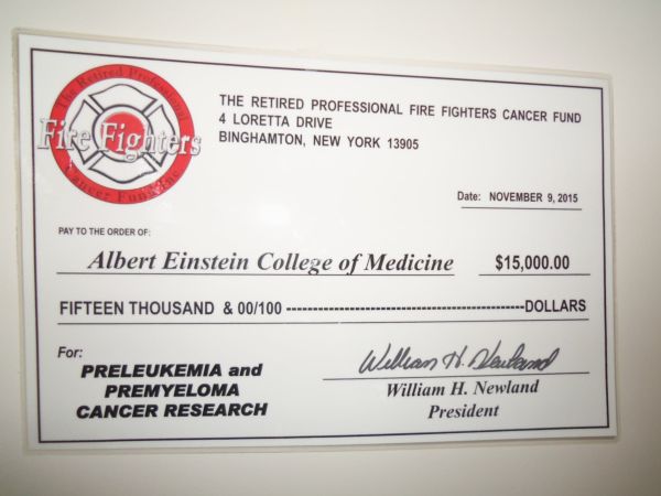 It is our extreme pleasure to announce our latest cancer research donation. On November 9, 2015 a $15,000.00 donation was made to Albert Einstein Medical College, Bronx, New York. The donation is earmarked for their Preleukemia and Premyeloma Research program. Two of the key investigators are dr. david Prezant, Chief Medical Officer, FDNY and Dr. Amit Verma, Professor of Medicine and Oncology at Albert Einstein College of Medicine. A sincere "THANK YOU" to all of our generous donors - YOU have made this happen. Since 2010, YOU have allowed us to donate $152,000.00 to established, promising cancer research prgrams. To donate click on the "DONATE" button on the top/right hand corner of our home page.